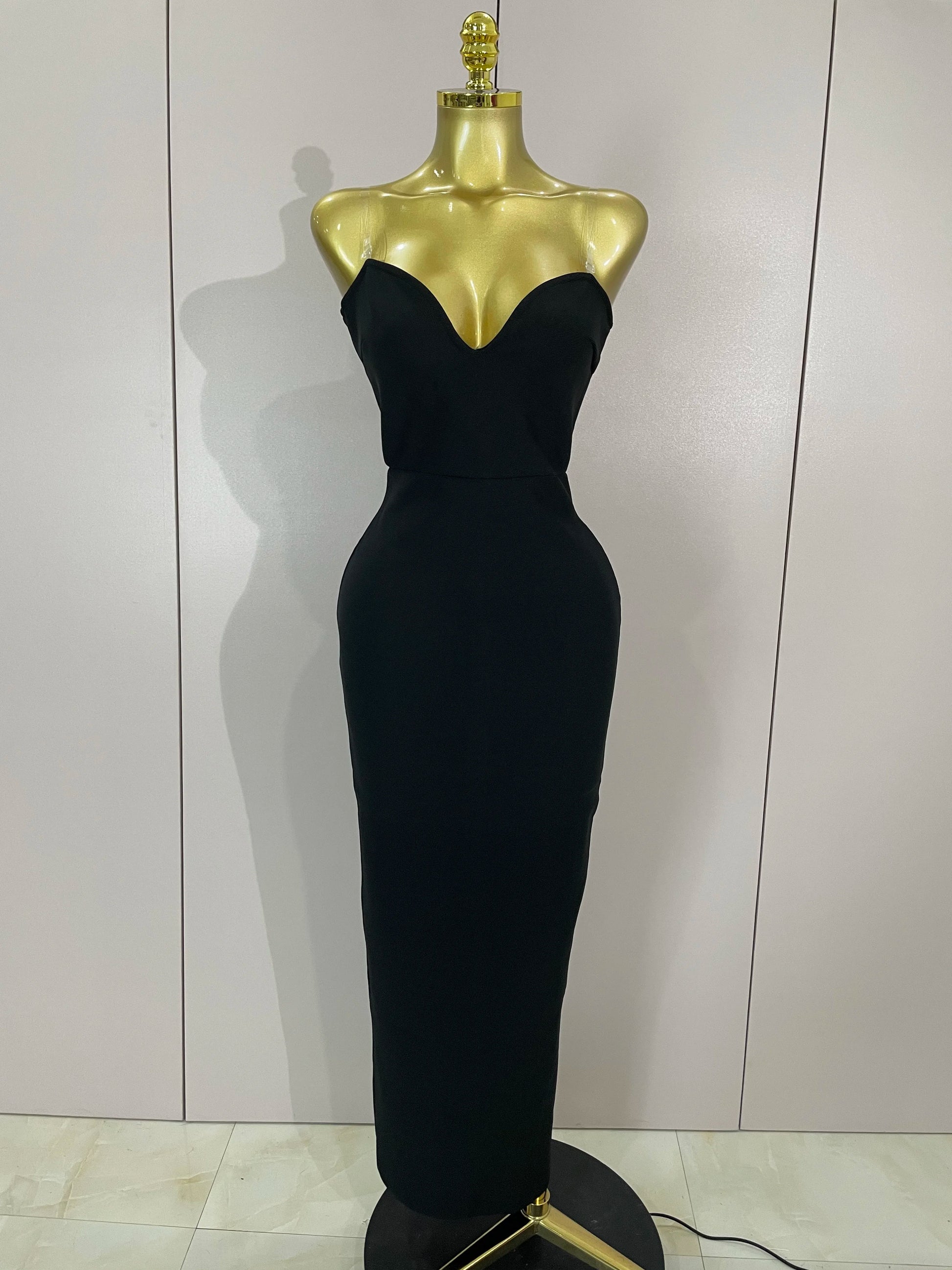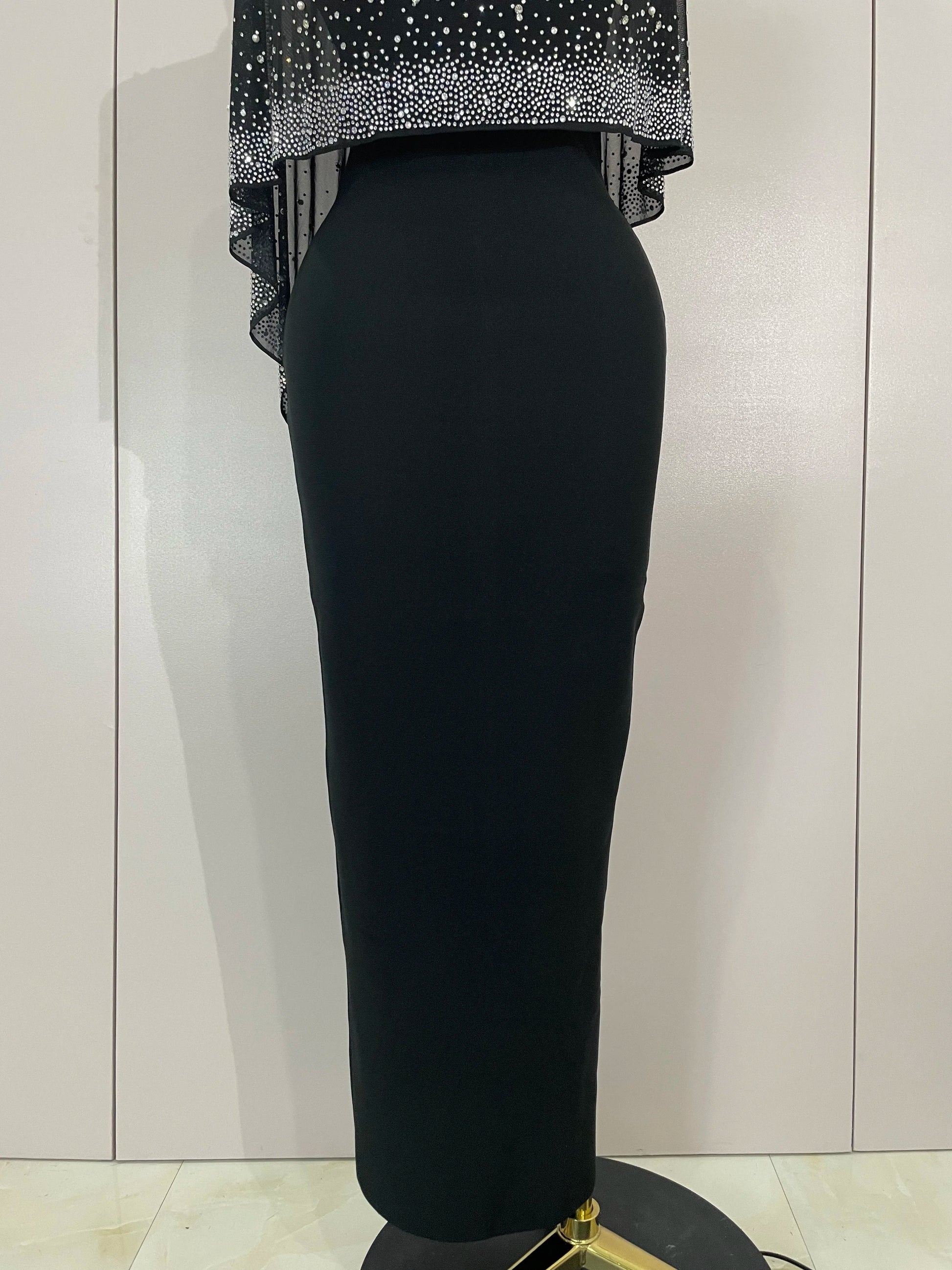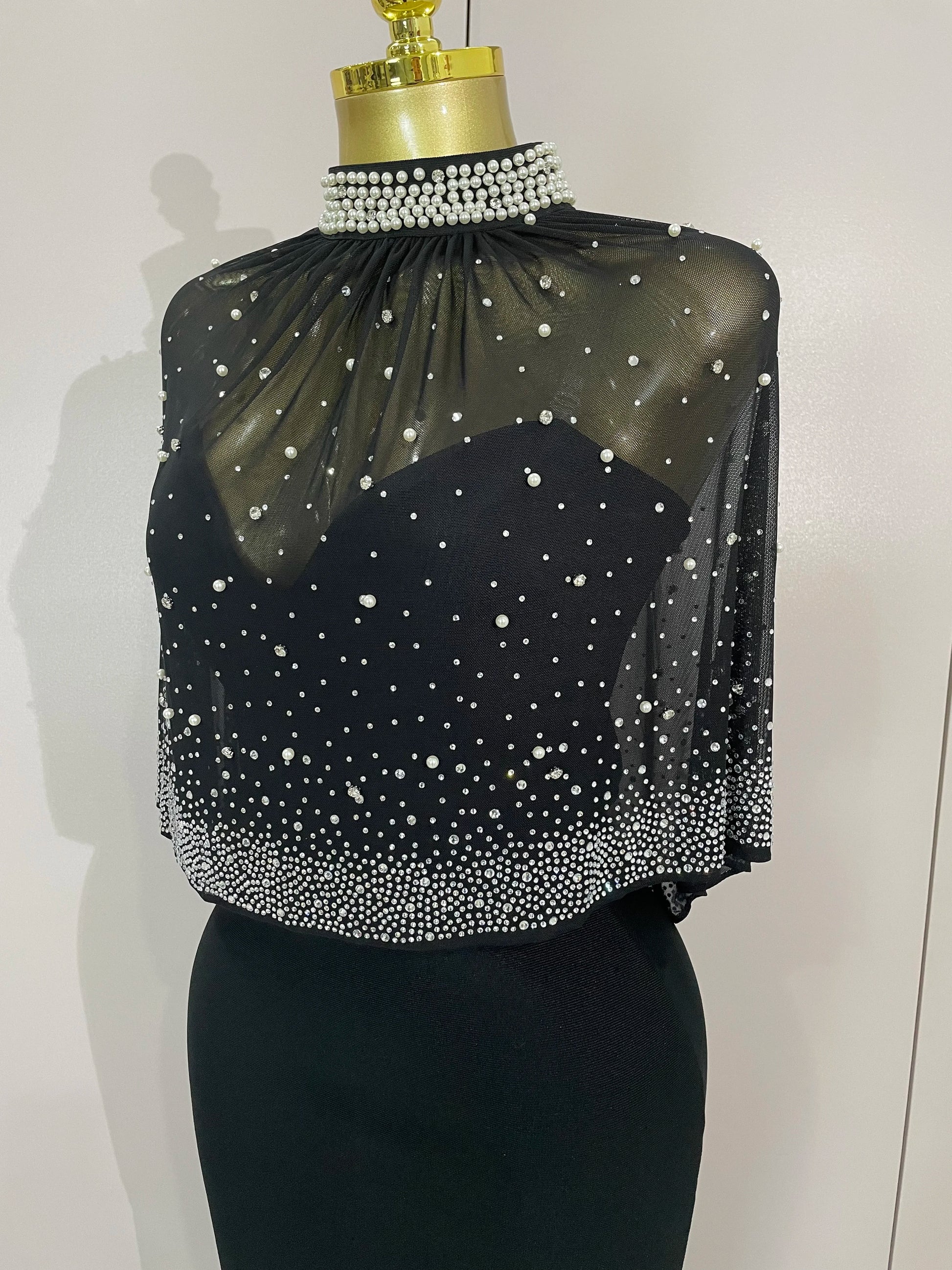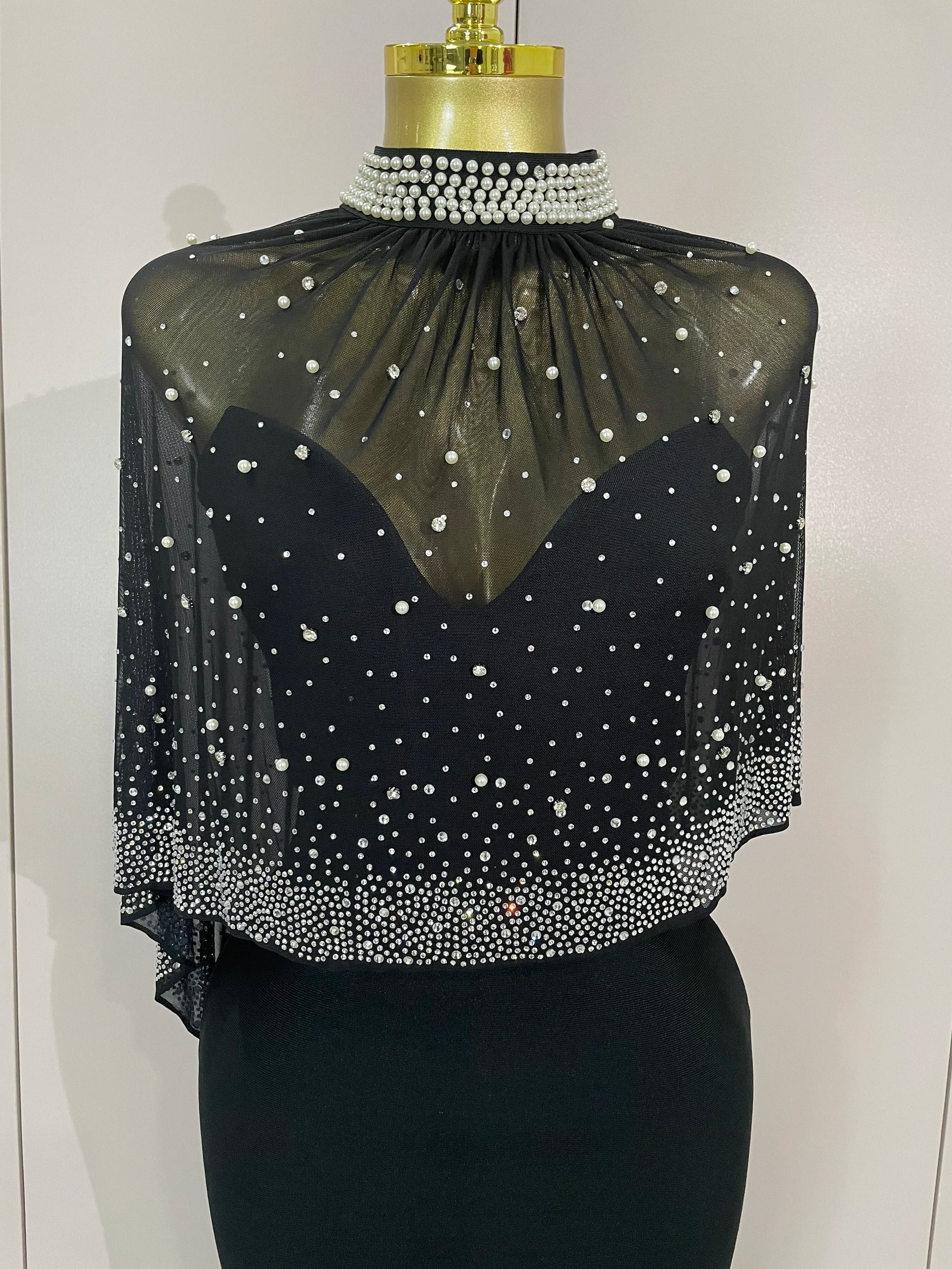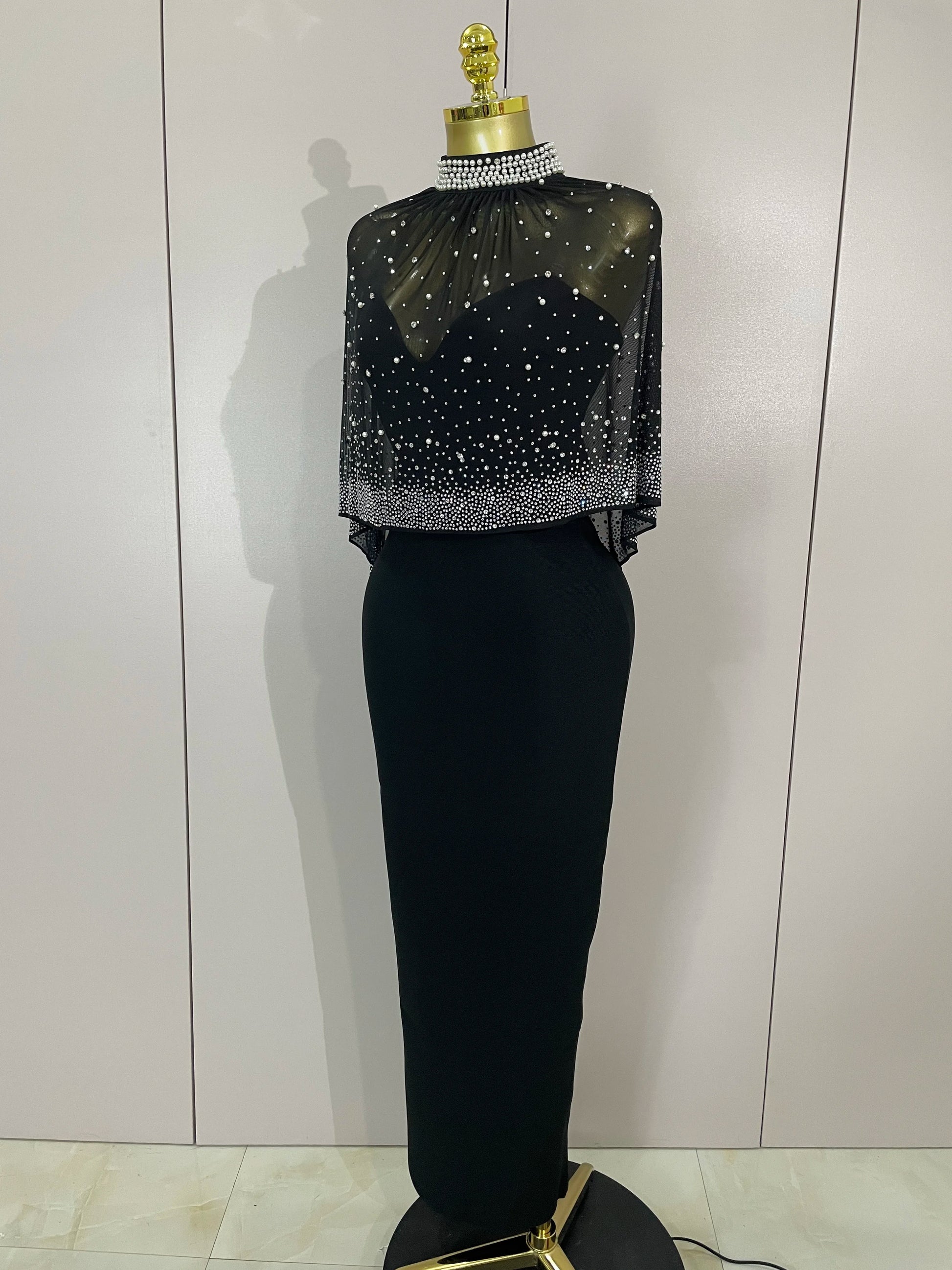 STOCK Elegant Black Strapless Long Bandage Dress With Sheer Rhinestone Beaded Cape Women Evening Celebrity Luxury Birthday Gown